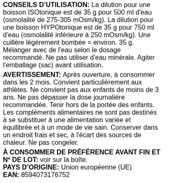 En raison de la teneur élevée en glucides et en électrolytes rapidement absorbables, la forme liquide instantanée d'ISODRINX est une source d'énergie idéale avec des quantités optimales de nutriments, de minéraux et de vitamines. La nouvelle formule ne contient pas d'édulcorants.