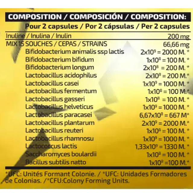 15 souches probiotiques diversifiées - Complexe multi-genres unique (Bifidobacterium, Lactobacillus, Saccharomyces, Bacillus) pour couvrir l'ensemble de l'écosystème intestinal, contrairement aux formules mono-souches