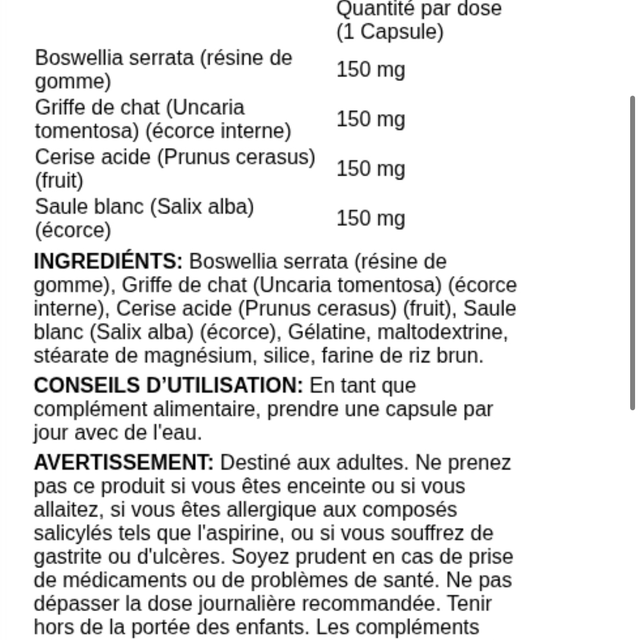 Chaque capsule de 600 mg (4 herbes à 150 mg) cible l’inflammation, booste la mobilité et protège vos genoux, dos et hanches.