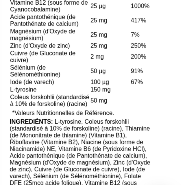• Soutient la production d’hormones thyroïdiennes grâce à l’iode, sélénium et tyrosine.